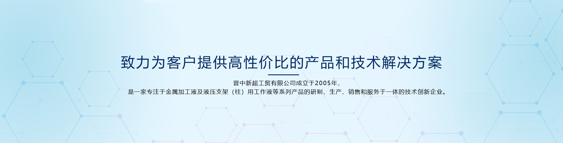 晉中新超工貿(mào)有限公司成立于2005年,是一家專(zhuān)注于金屬加工液及液壓支架(柱)用工作液等系列產(chǎn)品的研制、生產(chǎn)、銷(xiāo)售和服務(wù)于一體的技術(shù)創(chuàng)新企業(yè)。致力為客戶(hù)提供高性?xún)r(jià)比的產(chǎn)品和技術(shù)解決方案。